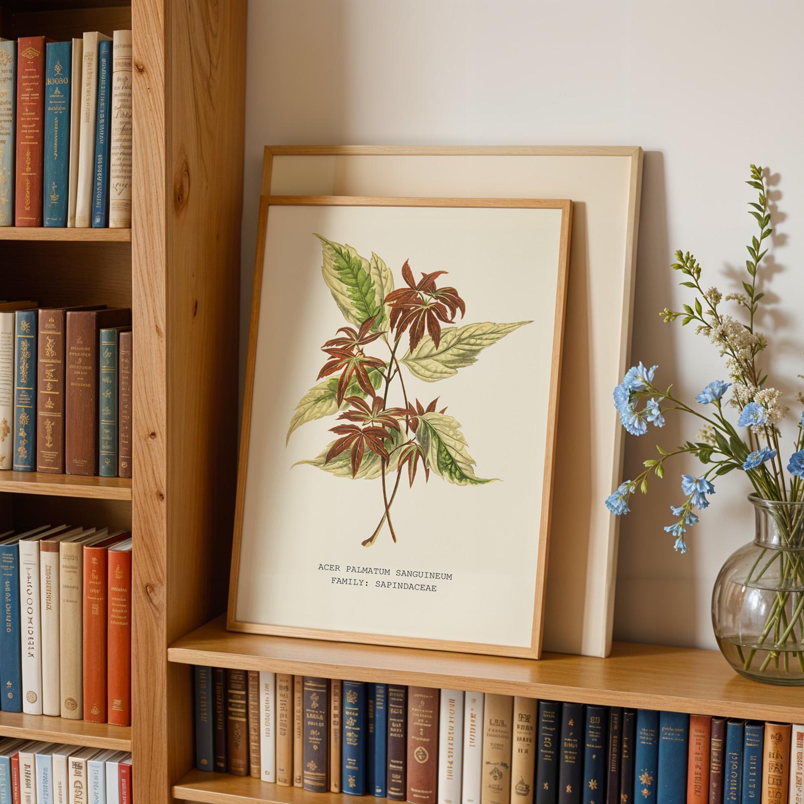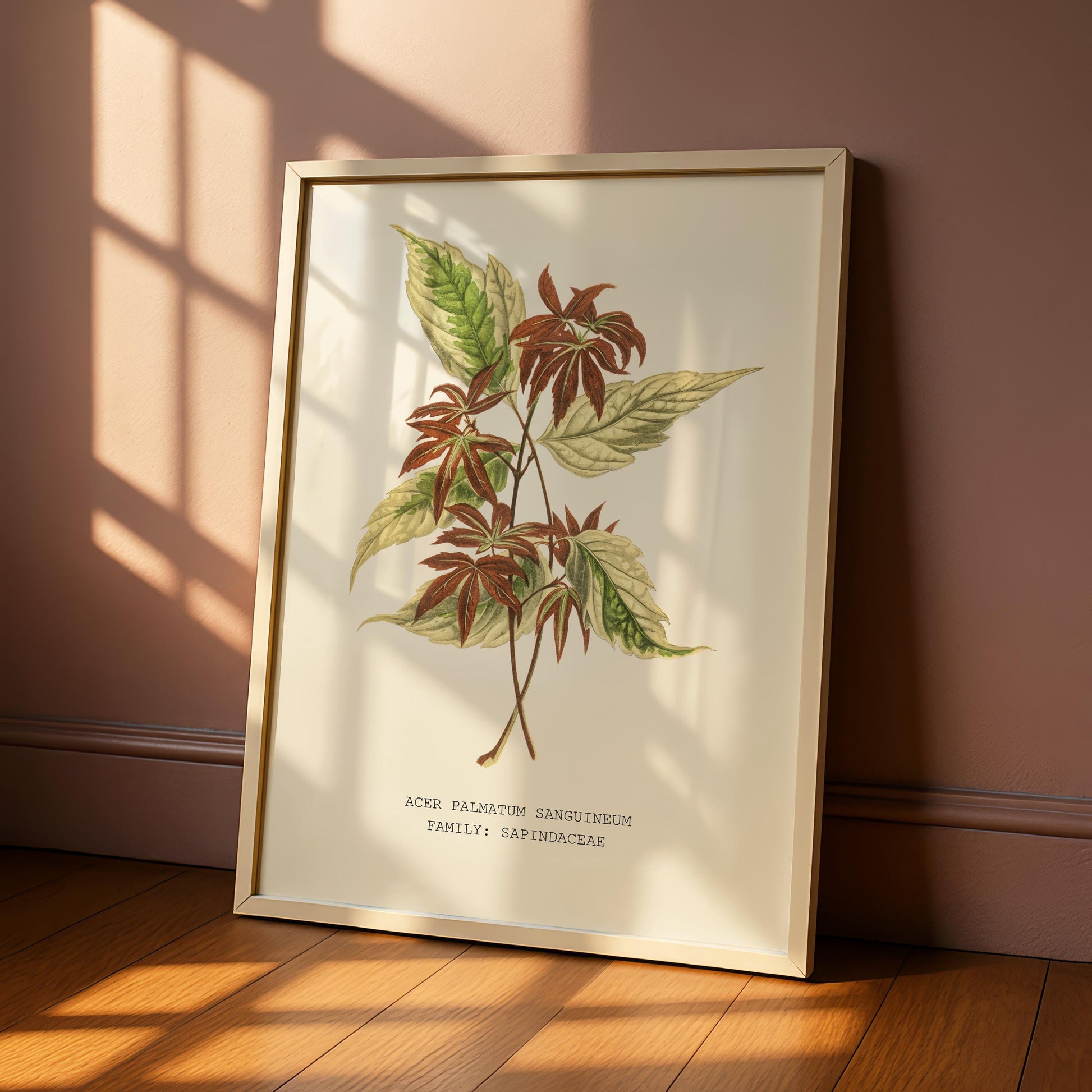 Vivid red Japanese maple leaves add warm seasonal elegance to modern or classic spaces. Giclée-printed on FSC-certified 200 gsm fine art paper, available in multiple sizes.