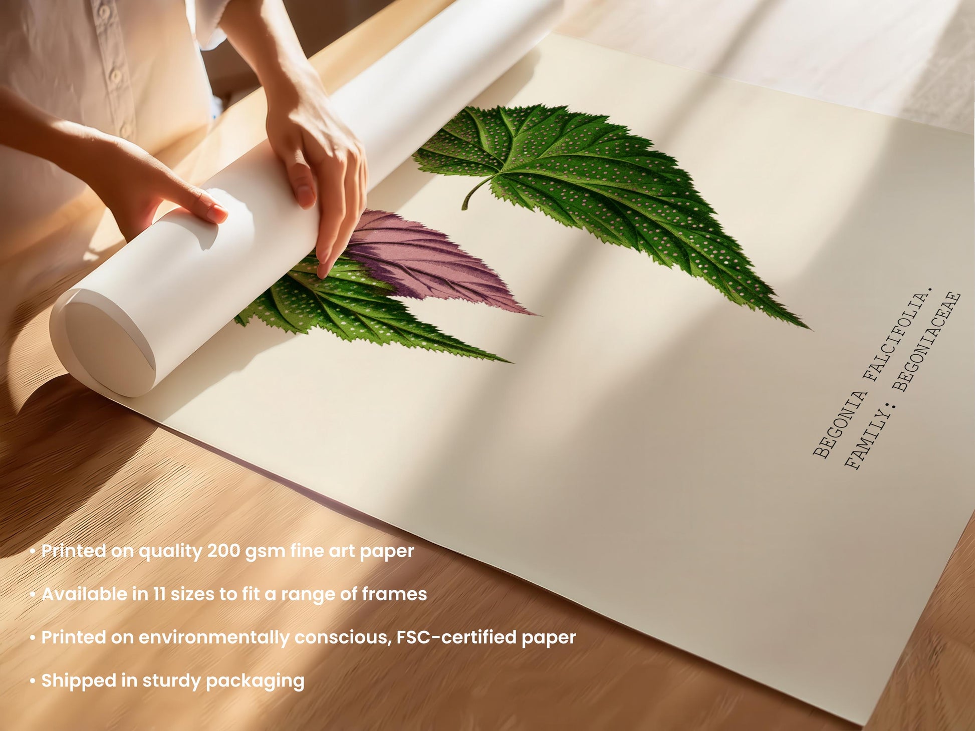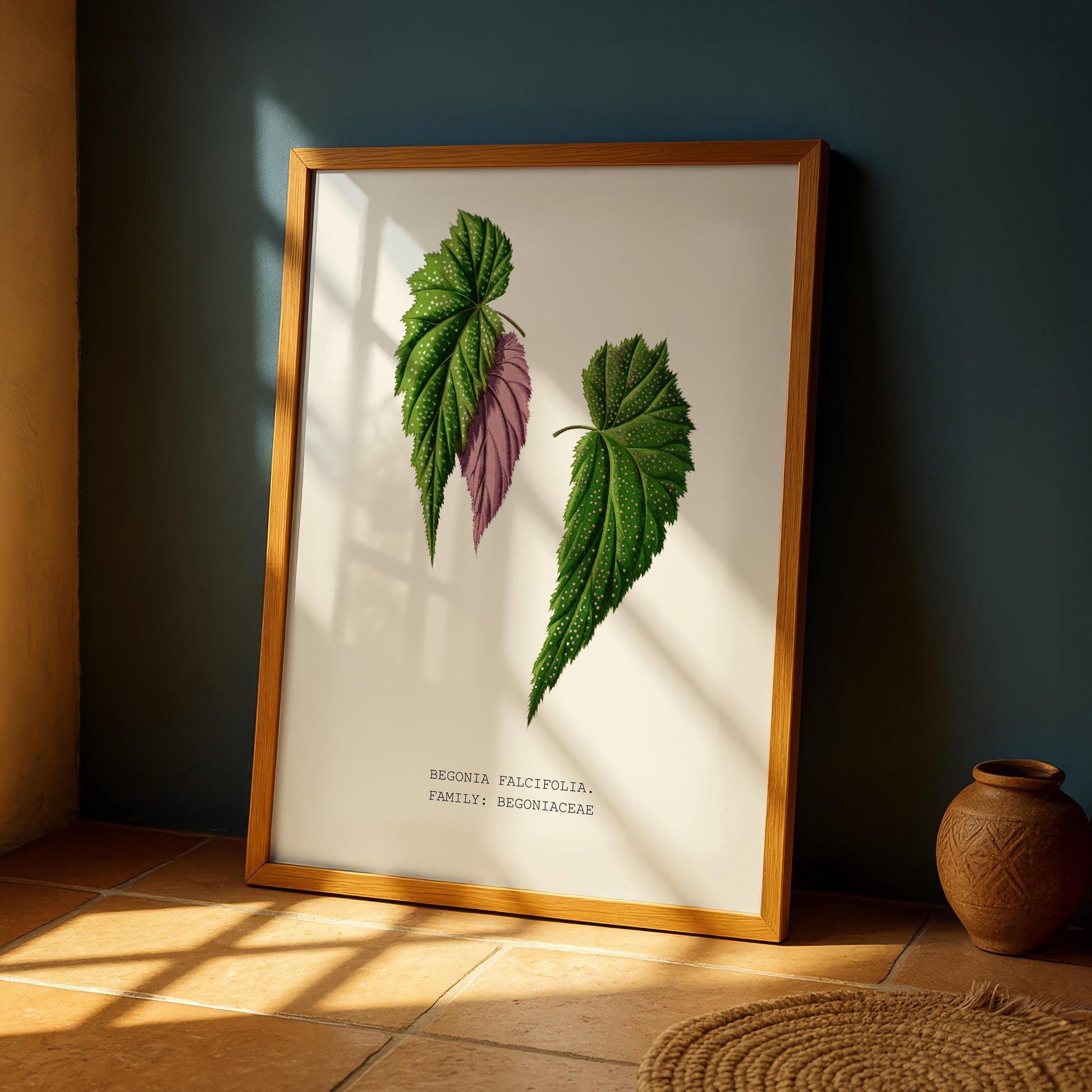Speckled green begonia leaves with pink undersides add exotic detail and soft colour to eclectic spaces. Giclée-printed on FSC-certified 200 gsm fine art paper, available in multiple sizes.