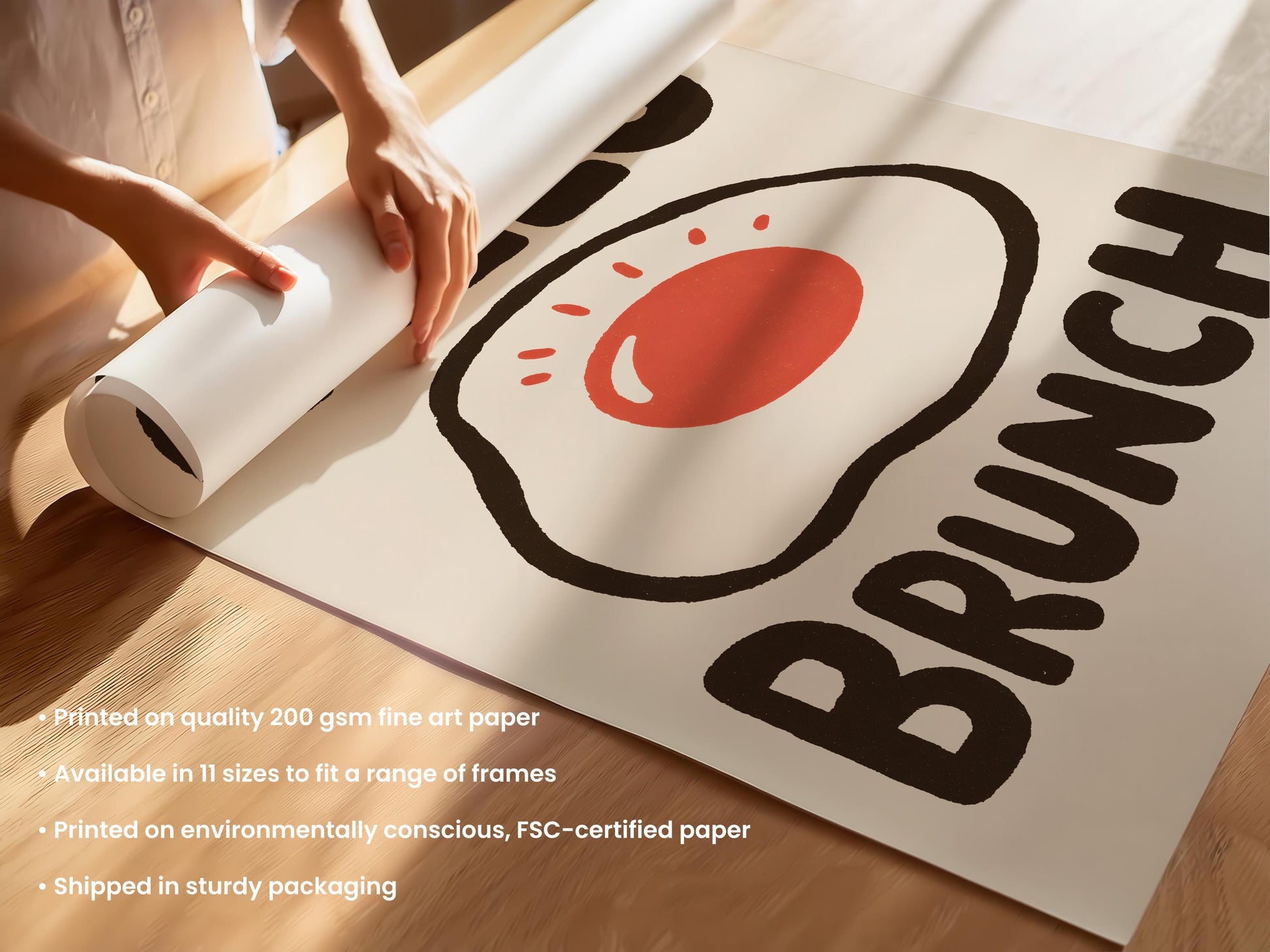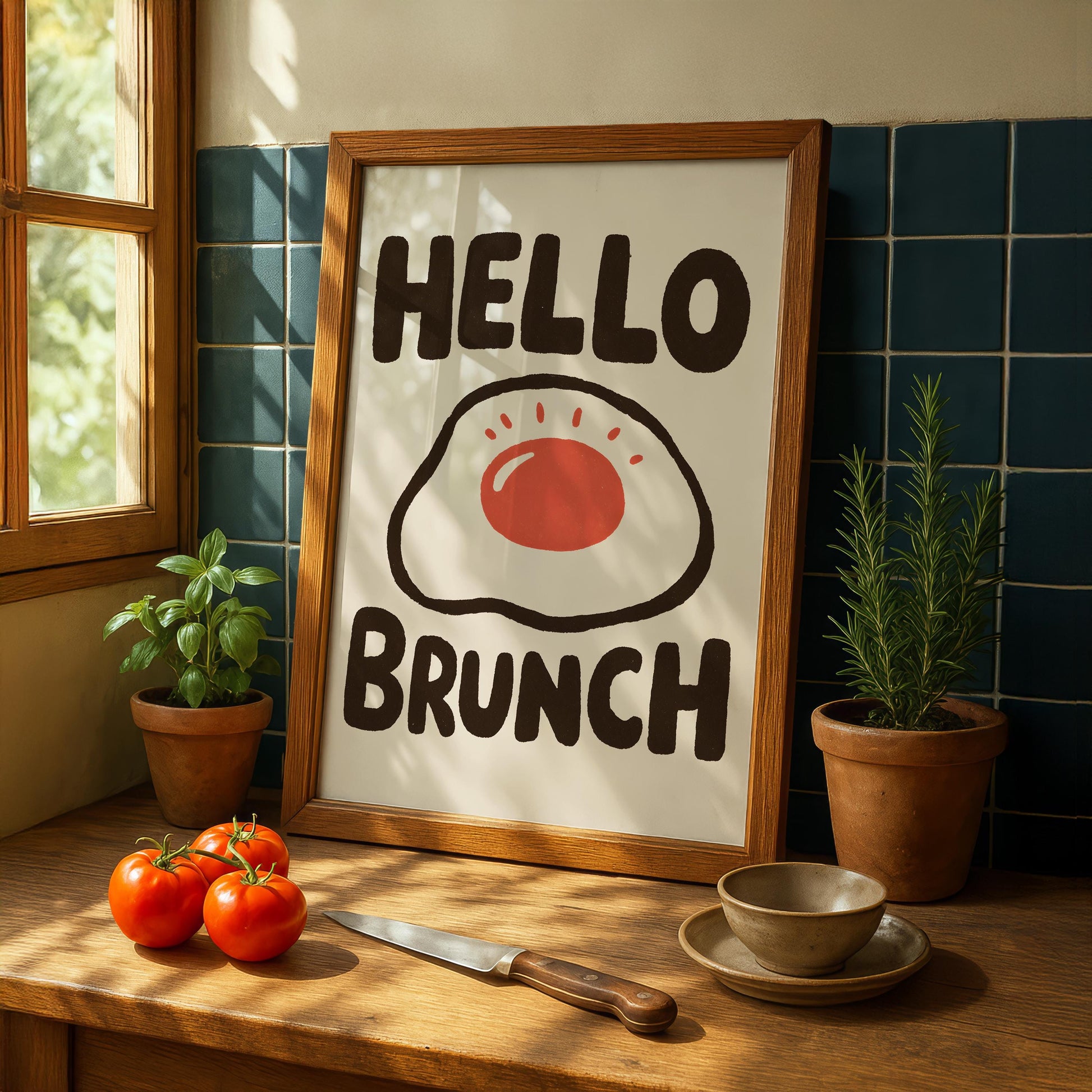 HELLO BRUNCH—bold type and a playful fried-egg graphic bring weekend energy to everyday mornings. Perfect for breakfast nooks, coffee stations, or gallery walls. Giclée-printed on FSC-certified 200 gsm fine art paper, available in multiple sizes.