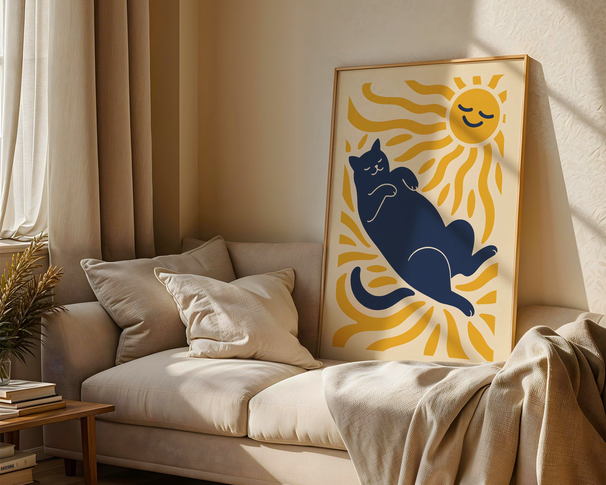 Bring a touch of modern warmth to your space with this Cat Matisse print, a serene scene of a sunbathing feline rendered in bold, minimal shapes. Inspired by cut-paper artistry, its clean lines and harmonious palette make it a versatile statement piece for living rooms, bedrooms, or creative workspaces.