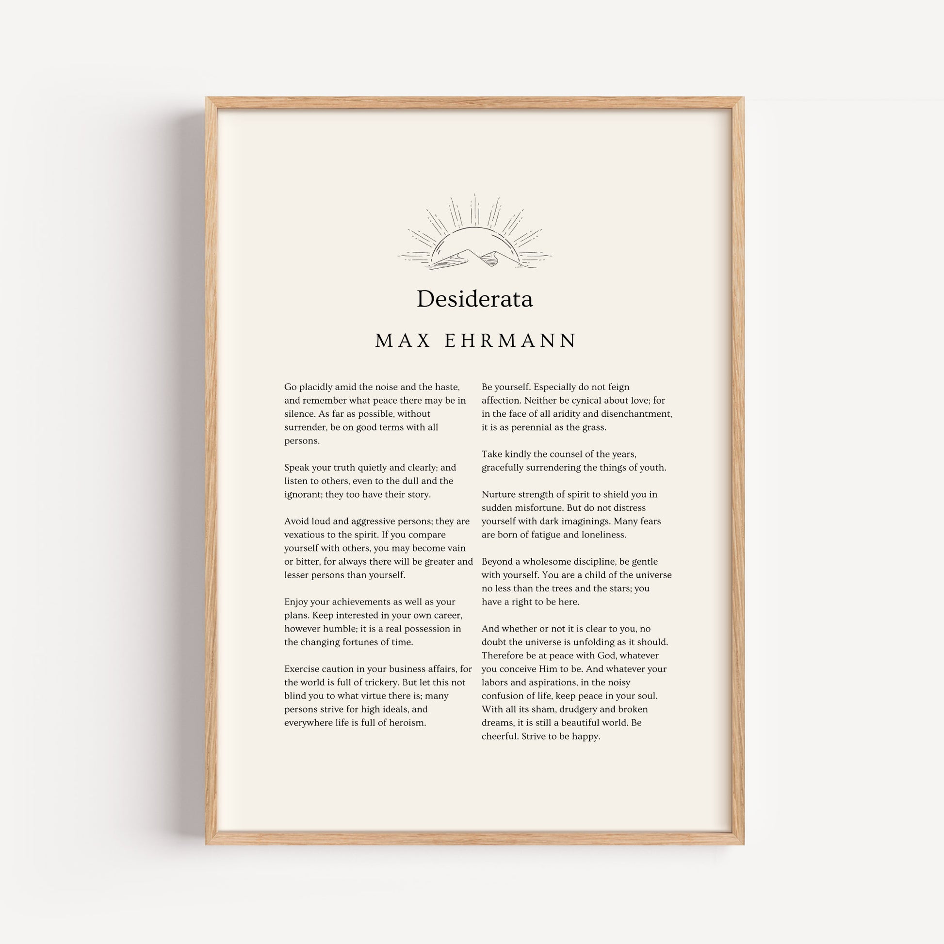 Esteemed in its simplicity, this Desiderata poem print features clean type and vintage sun-and-peak artwork—quiet wisdom for busy lives. A reflective piece of typographic wall art, ideal for offices or hallways. Giclée-printed on FSC‑certified 200 gsm fine art paper, available in ranges.