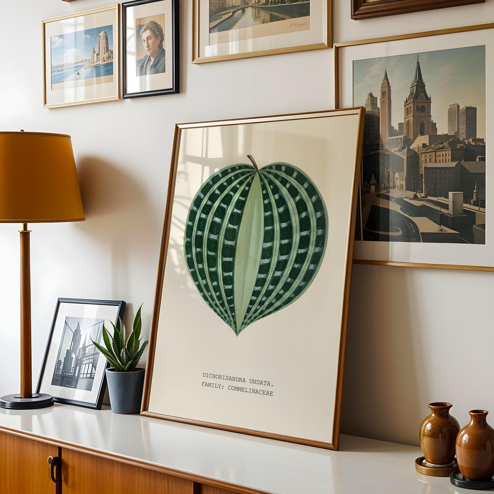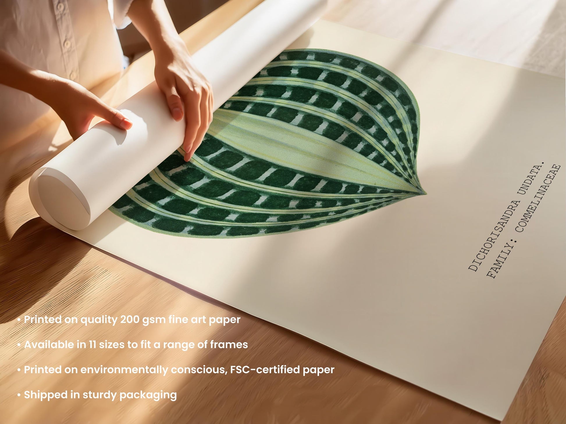 Heart-shaped Dichorisandra leaves striped in green and cream offer rare botanical character in vintage form. A distinctive plant print for living rooms or galleries. Giclée-printed on FSC-certified 200 gsm fine art paper, available in multiple sizes.