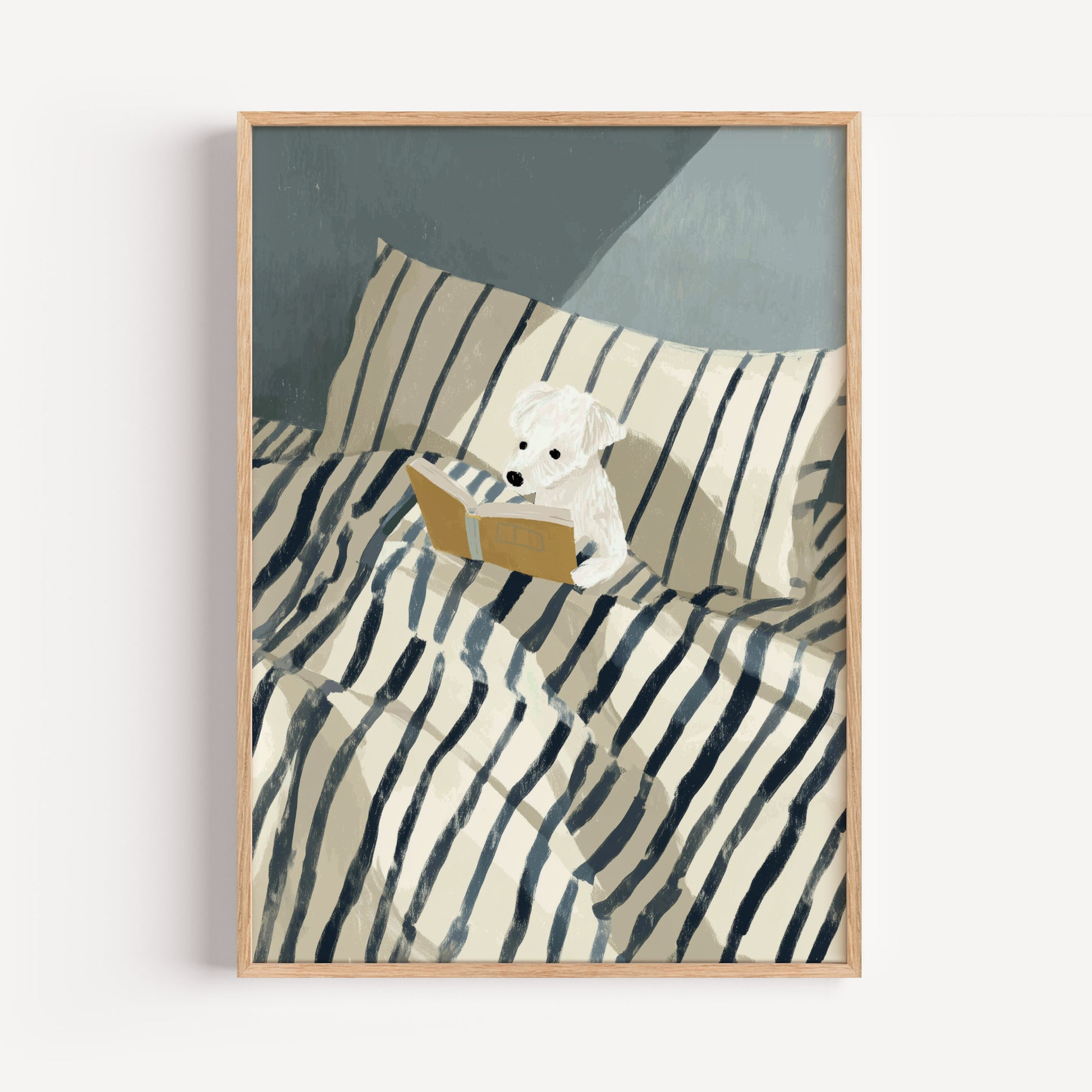 Bring a cosy touch to your home with this sweet dog reading print, showing a pup comfortably tucked into bed with a good book. Ideal for bedrooms or snug reading nooks, this print adds gentle warmth and humour. Professionally giclée printed on FSC-certified 200gsm fine art paper, available in multiple sizes—perfect for dog lovers.