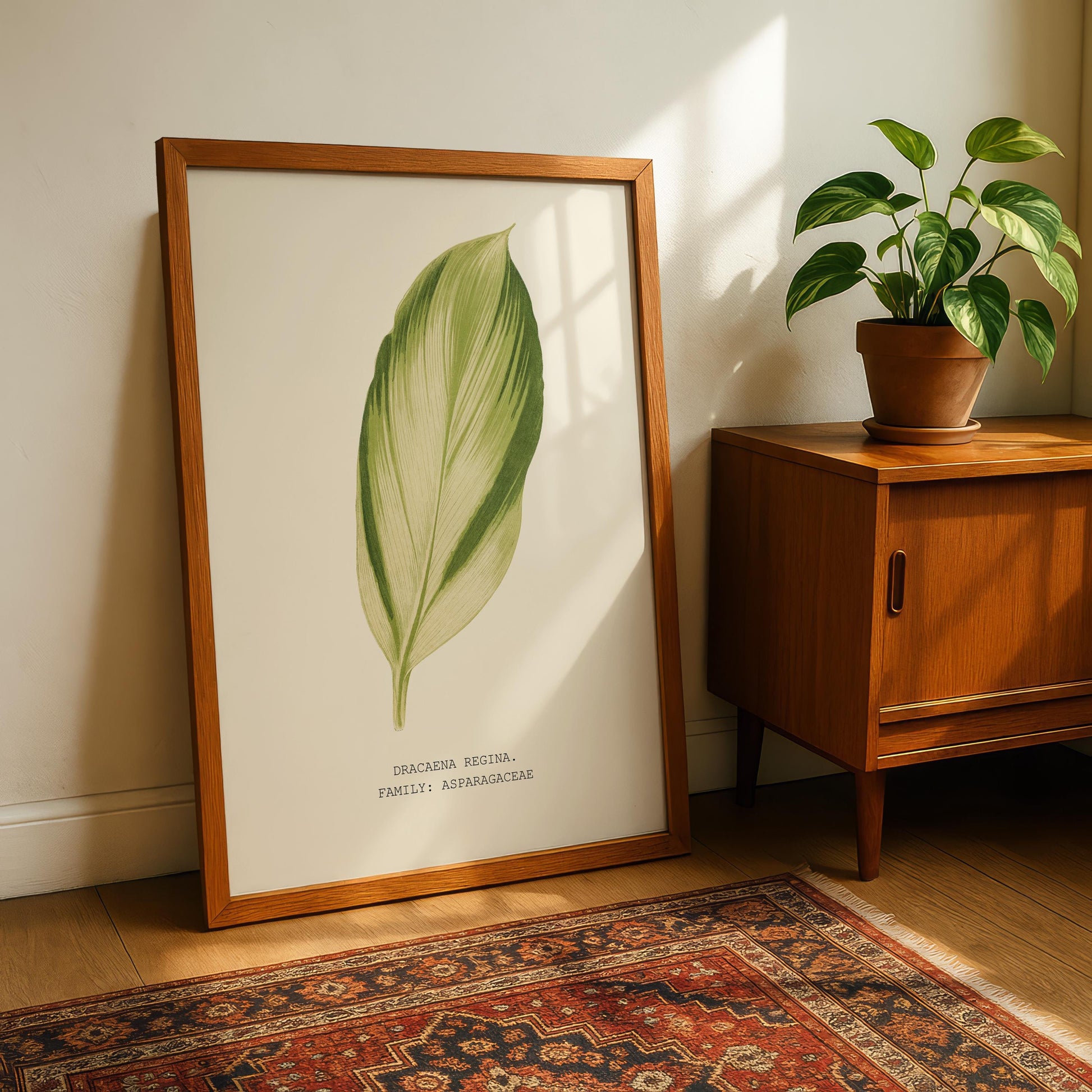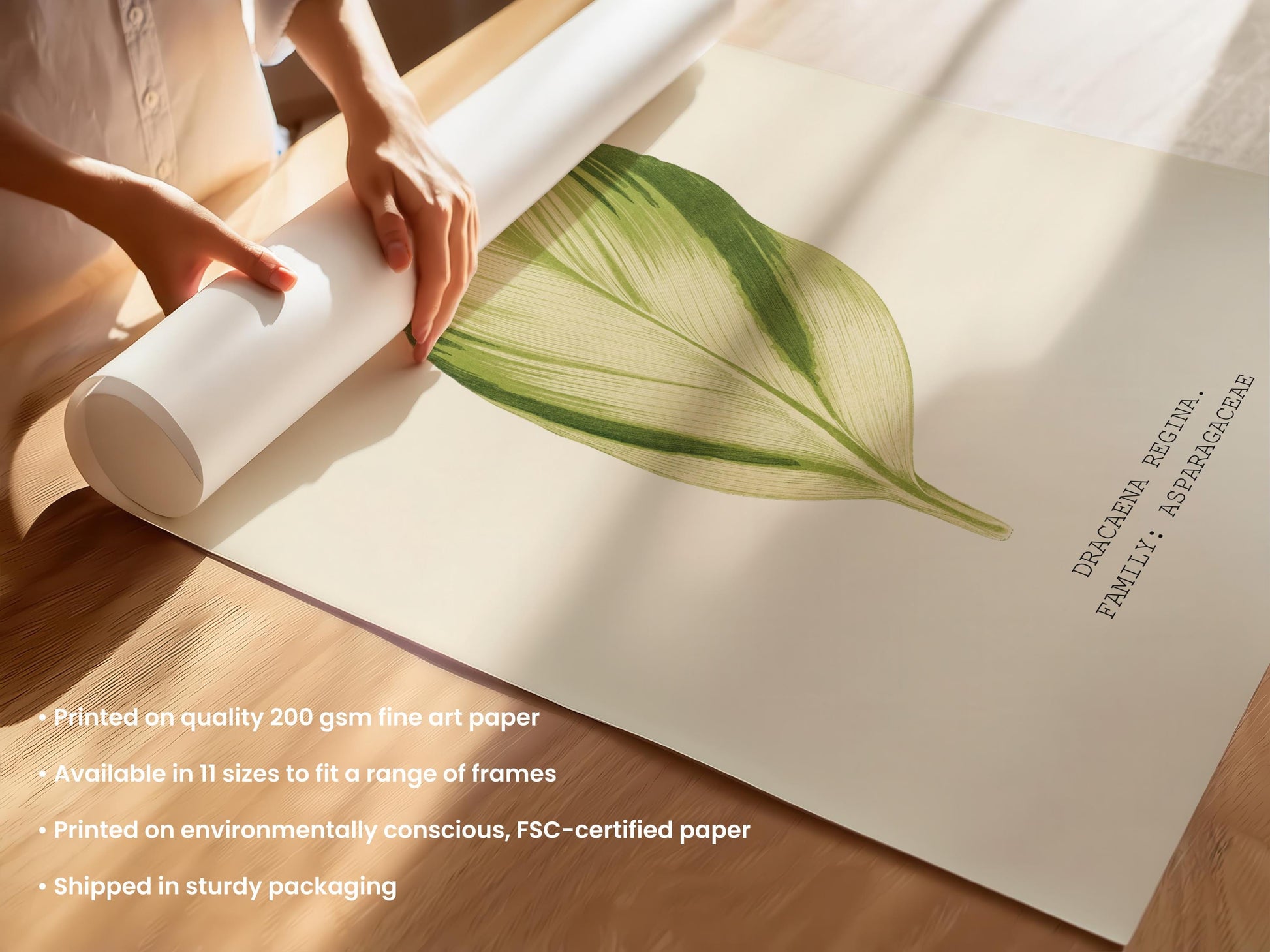 Long, tapered Dracaena regina foliage in green-and-cream variegation brings calm, architectural grace. A serene botanical accent for modern or tropical interiors. Giclée-printed on FSC-certified 200 gsm fine art paper, available in multiple sizes.