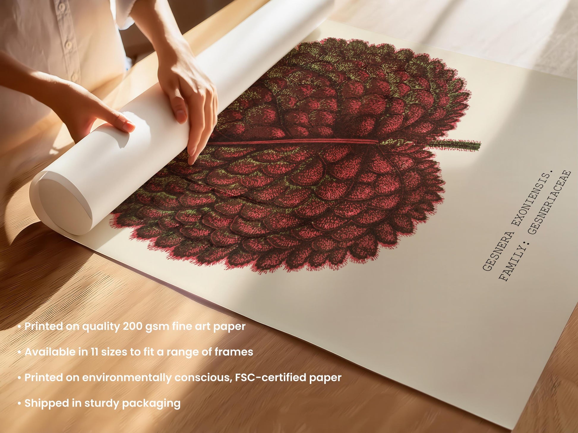 A bold, circular Gesnera leaf in deep green and red creates a dramatic focal point for eclectic botanical displays. Giclée-printed on FSC-certified 200 gsm fine art paper, available in multiple sizes.