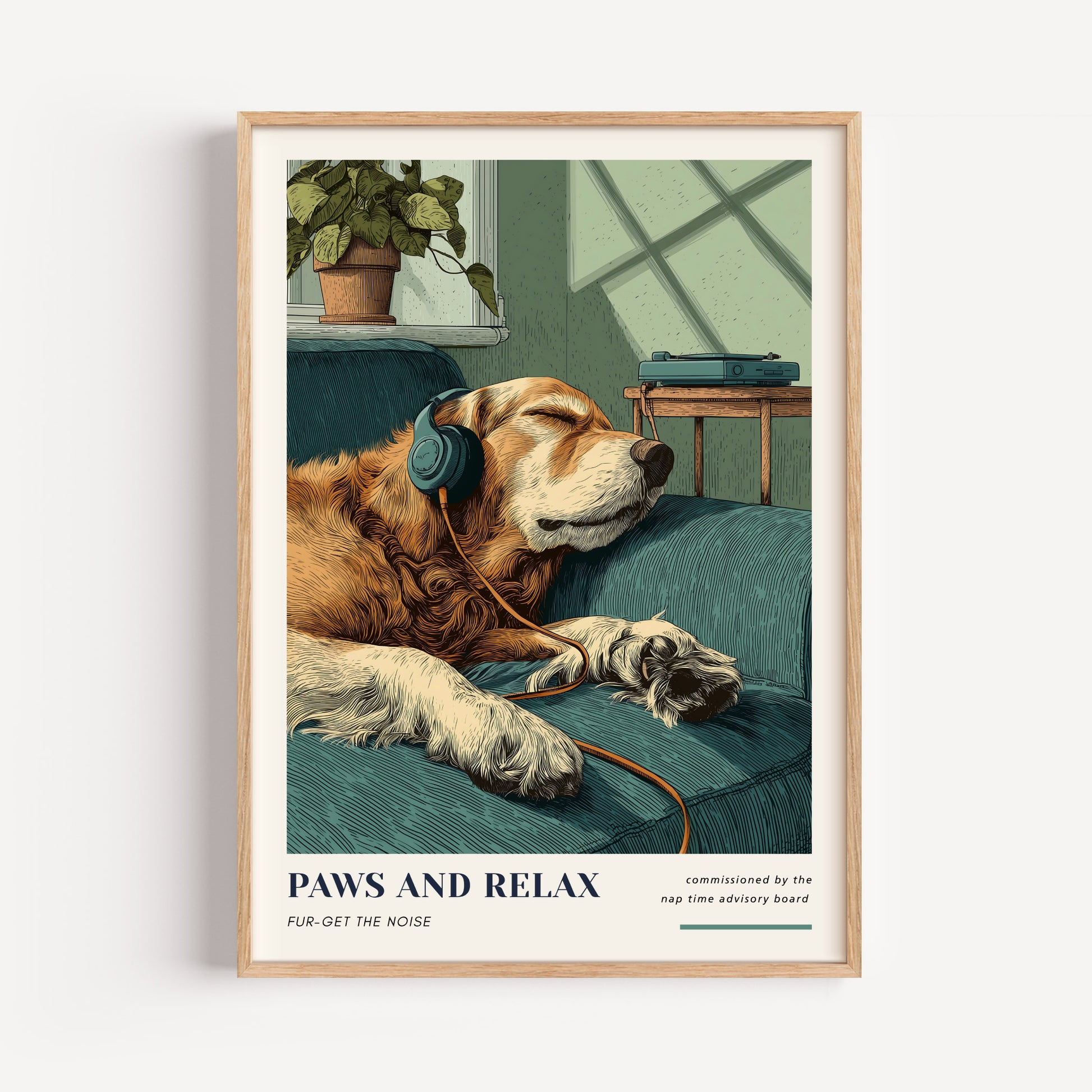 Relax your walls with this soothing Golden Retriever print. A chilled-out pup with headphones makes this ideal for bedrooms or relaxation corners. Professionally giclée printed on FSC-certified 200gsm fine art paper, available in various sizes—a peaceful addition for dog lovers.