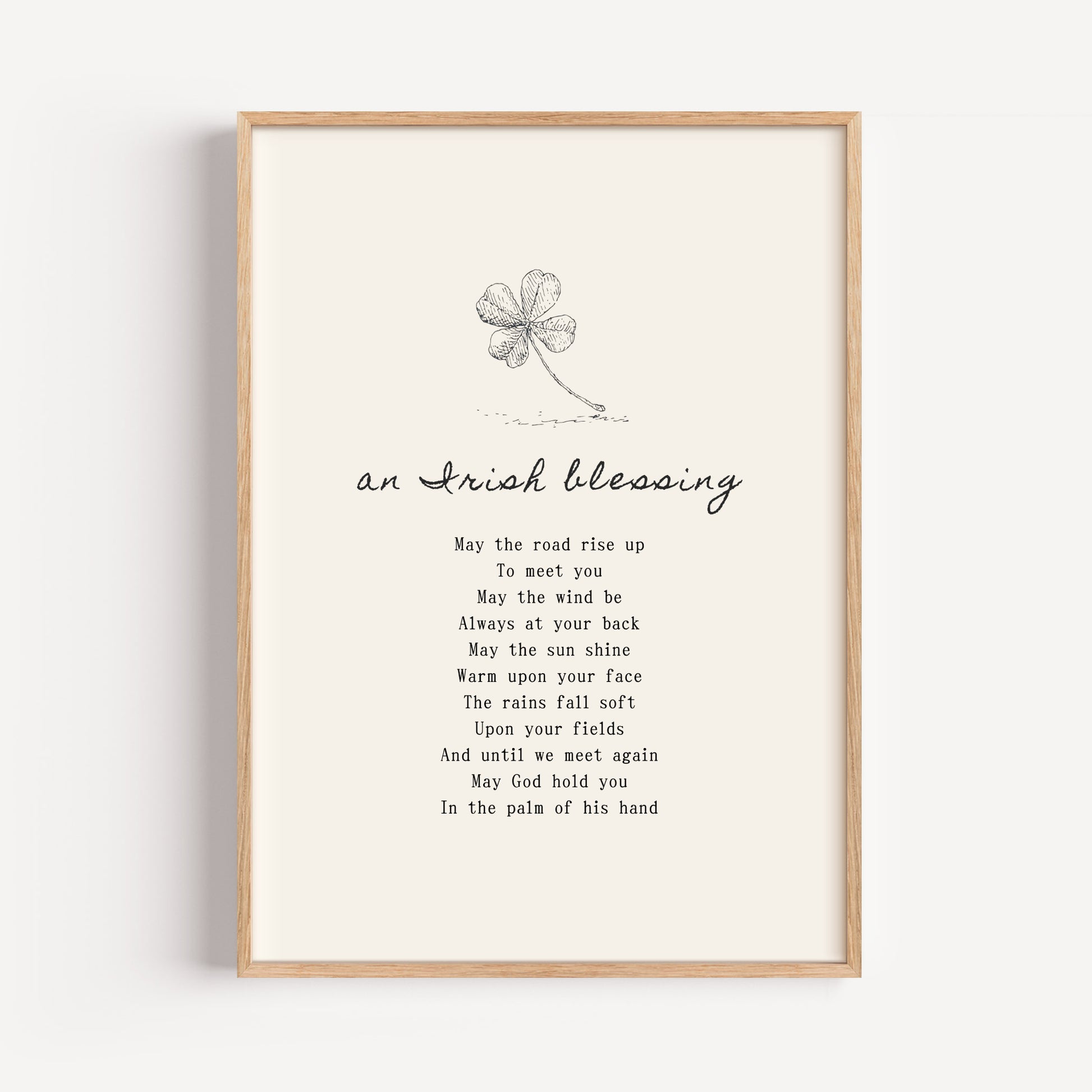 This Irish blessing wall art print with a four-leaf clover and timeless prayer brings rustic charm and meaning to entryways or heartfelt gallery spaces. A thoughtful gift or decor piece rooted in tradition. Printed on FSC‑certified fine art paper, available in multiple sizes.