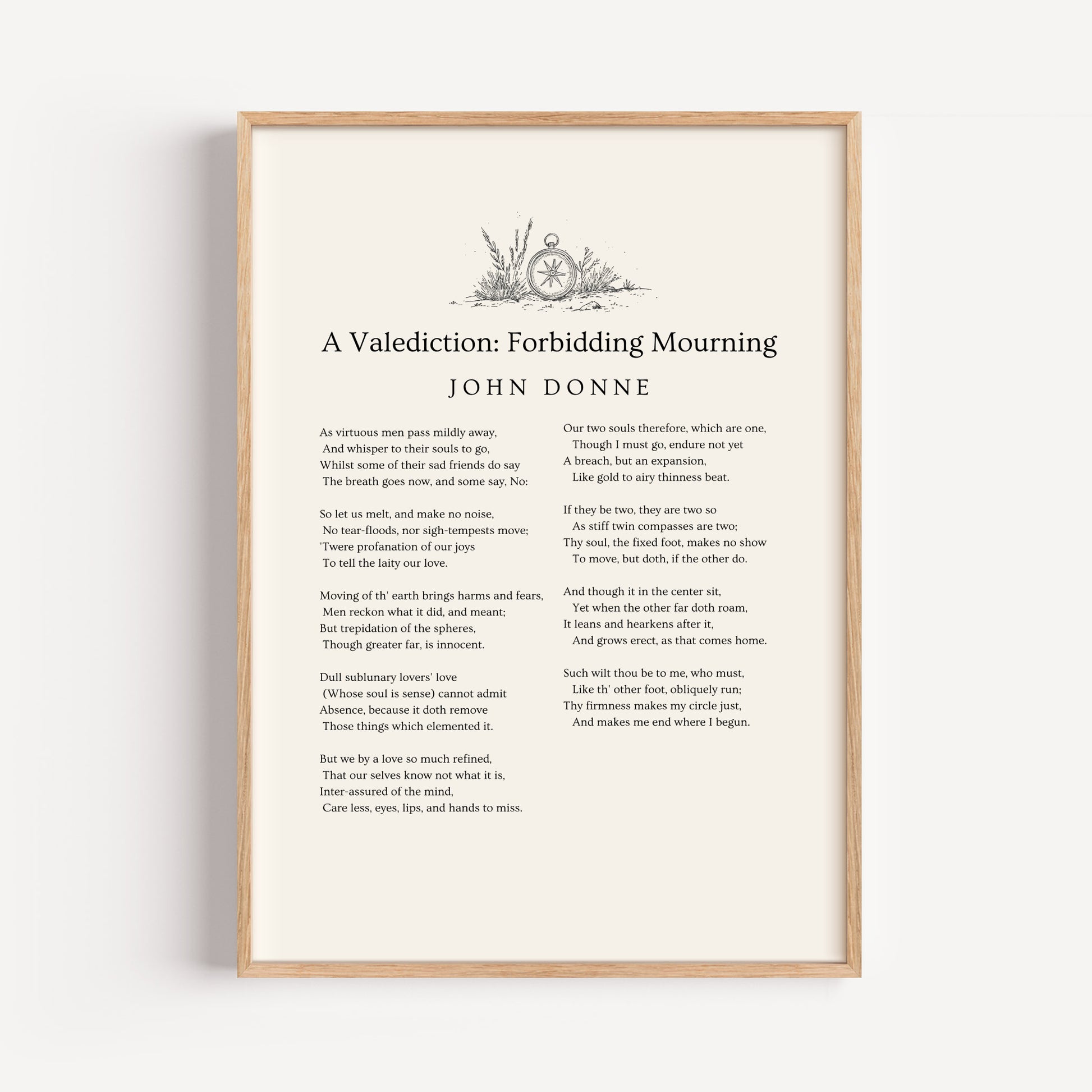 A romantic literary tribute, this John Donne poetry print transforms A Valediction: Forbidding Mourning into minimalist wall art. A heartfelt gift for loved ones or a quiet statement piece in intimate spaces. Professionally printed on FSC‑certified 200 gsm paper, available in several sizes.