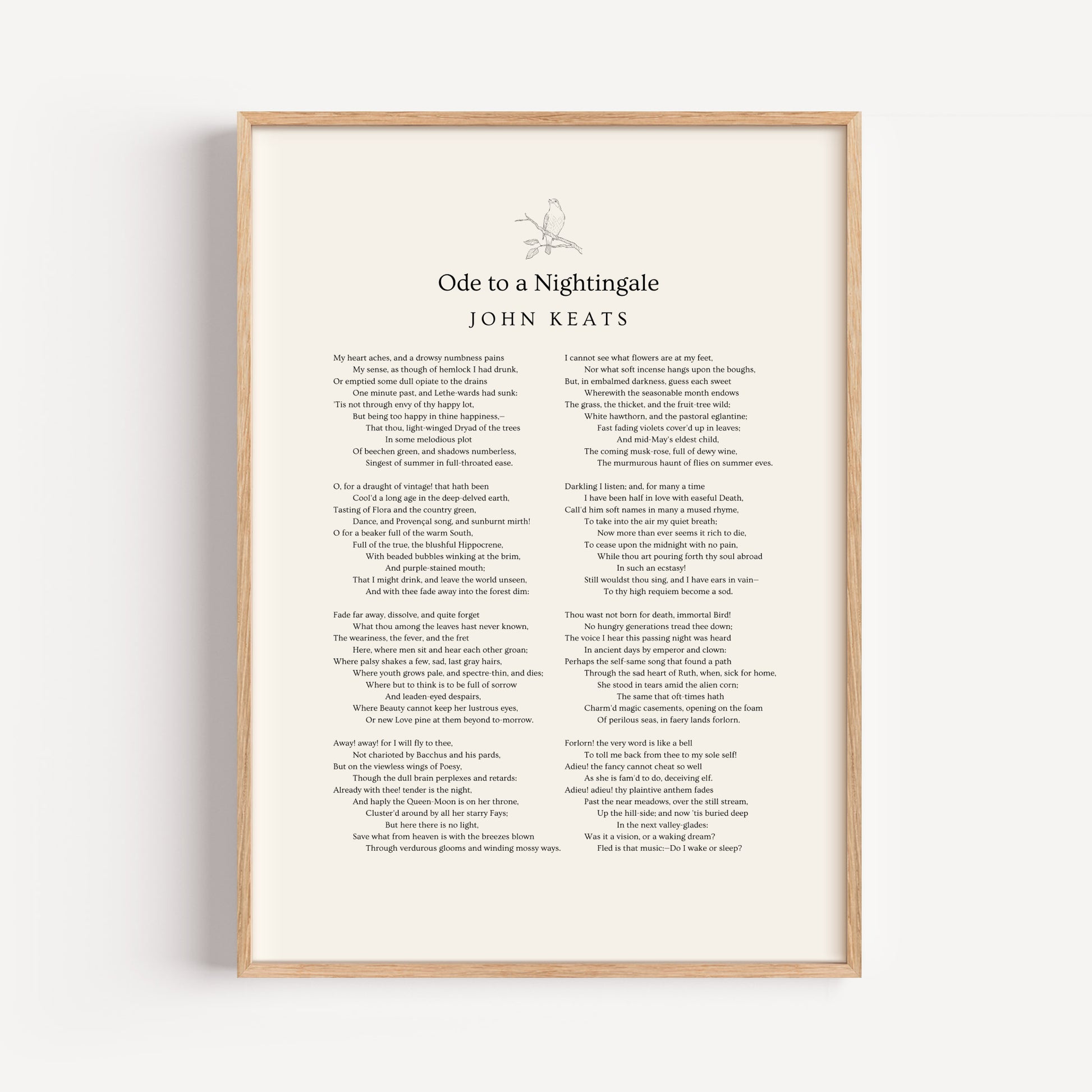 Gently lyrical, this Keats Ode to a Nightingale print brings romantic, poetic flight to any space. Ideal for reading corners or thoughtful interiors. Professionally printed on FSC‑certified 200 gsm fine art paper, available in a variety of sizes.