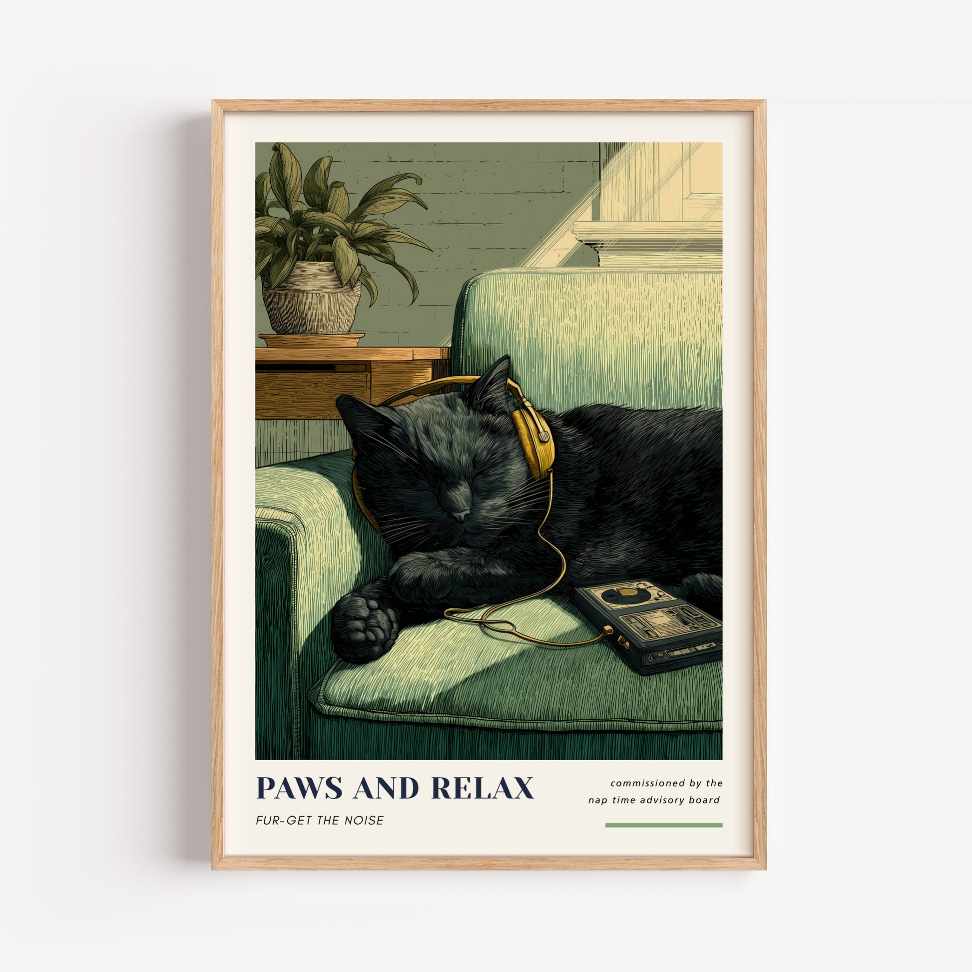 This “Paws and Relax” print shows a black cat unwinding with headphones in retro style—ideal wall art for music lovers, cat parents, or any cozy reading nook. Professionally giclée printed on FSC‑certified 200 gsm fine art paper and available in multiple sizes.