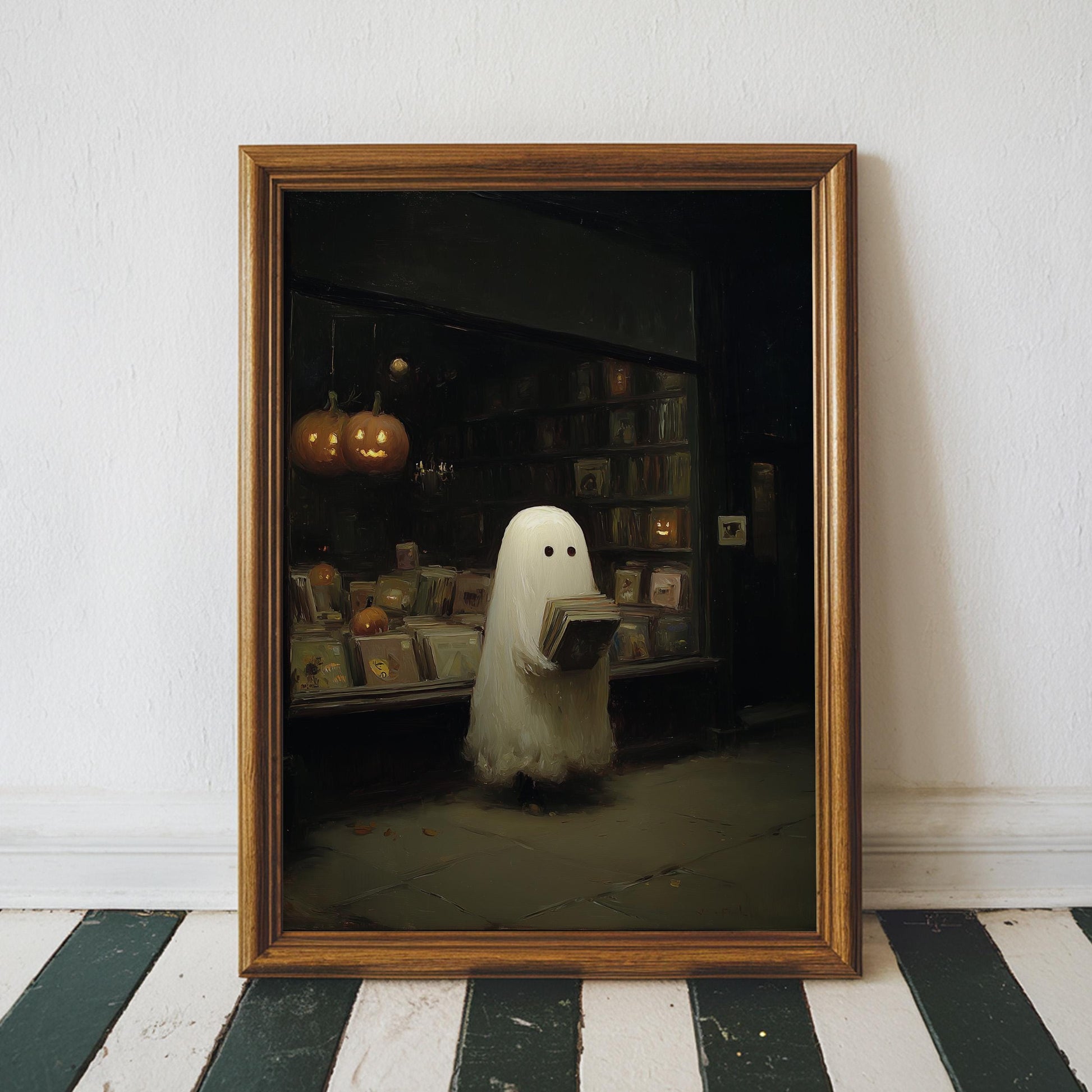 A cheerful ghost browses vinyl in a jack-o’-lantern lit record shop, painted with nostalgic detail. A playful Halloween piece for music lovers and cosy gothic interiors. Giclée-printed on FSC-certified 200 gsm fine art paper, available in multiple sizes.