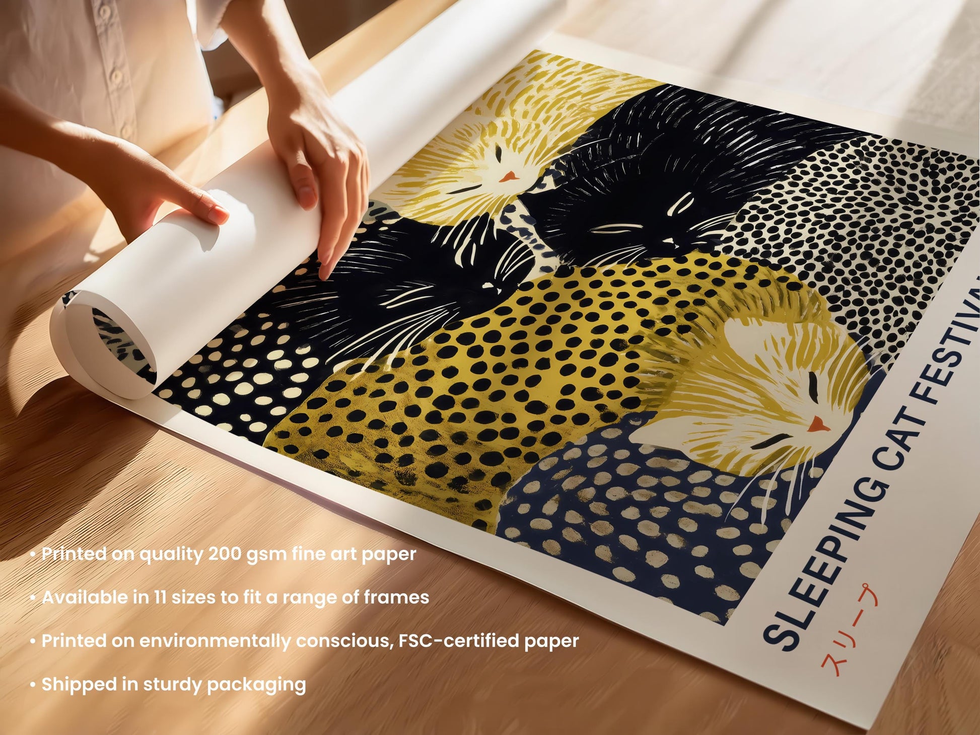 Dotted Kusama-style patterns and earthy tones reimagine curled cats in playful Japanese-inspired design. A unique Japandi wall art print for bedrooms, studios, or creative spaces. Giclée-printed on FSC-certified 200 gsm fine art paper, available in multiple sizes.