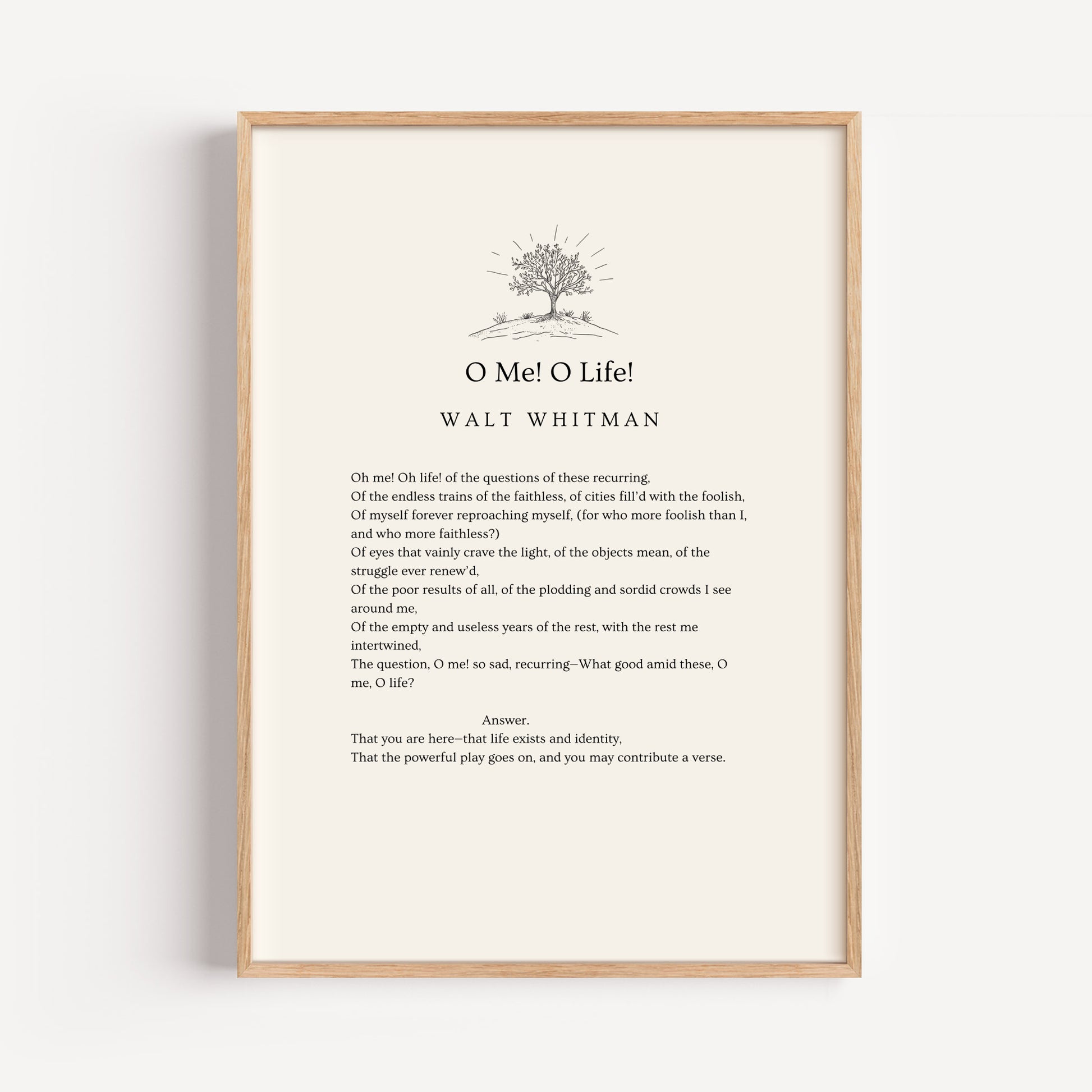 Add depth to your space with this thoughtful "O Me! O Life!" print by Walt Whitman. Its simple design is perfect for inspiring quiet contemplation in offices or creative spaces. Professionally giclée printed on FSC-certified 200gsm fine art paper, available in multiple sizes—a meaningful gift for literature lovers.
