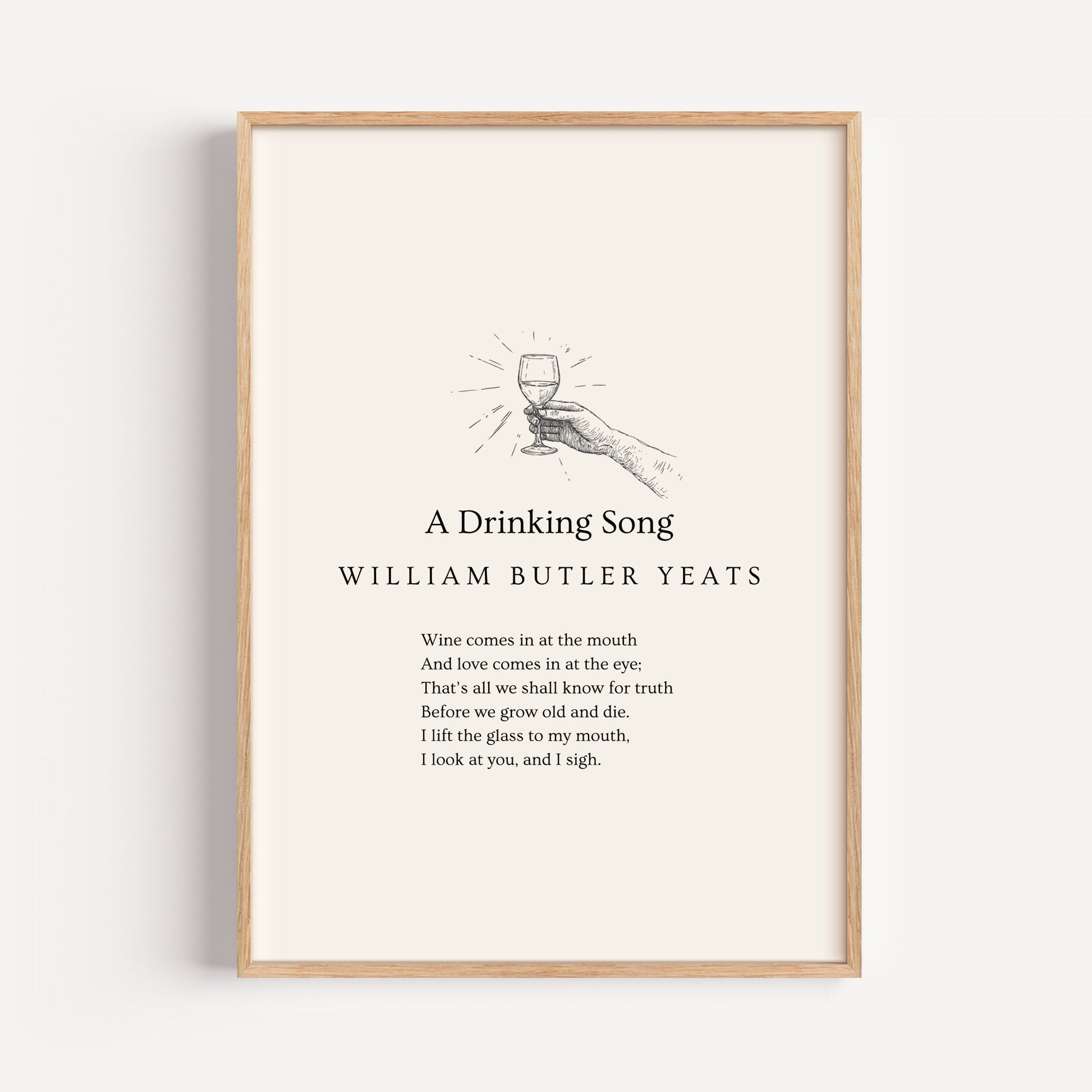 A delicate poetry wall art print featuring Yeats’ "A Drinking Song," ideal for cosy bedrooms, bars, or reading corners. Printed on FSC‑certified paper, available in multiple sizes.